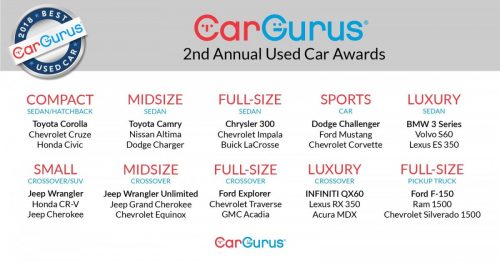 Shoppers interested in the Best Used Car Award winners can search for great deals on CarGurus.com. CarGurus analyzes millions of car listings daily, then ranks search results according to which listings offer the best deals from the best rated dealers. CarGurus.com users can also see vehicle history, dealer reviews, days on market and price drops for listings.