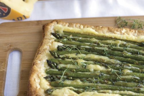 Remove pastry shell from oven and sprinkle with shredded cheese. Trim bottoms of asparagus spears to fit crosswise inside pastry shell; arrange in single layer over cheese, alternating ends and tips. Brush with oil, sprinkle with thyme leaves and season with salt and pepper. Bake until spears are tender, about 20 minutes.