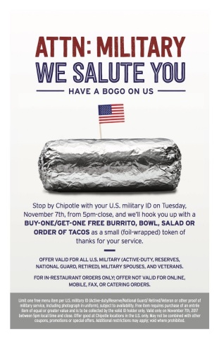 In honor of those who serve, Chipotle Mexican Grill will offer our country’s heroes a special thank you with a buy-one-get-one (BOGO) offer from 5 p.m. to close on the Tuesday before Veterans Day, Nov. 7.