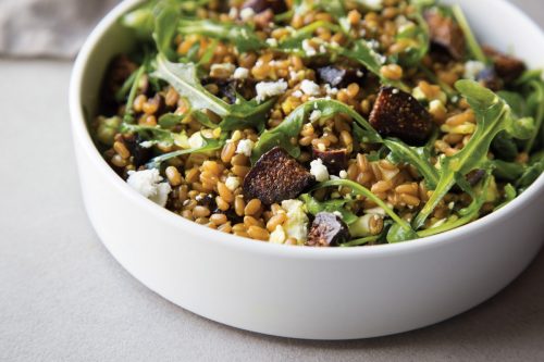 In large bowl, whisk lemon juice, red wine vinegar, olive oil, shallot, mustard, salt, pepper and turmeric. Add farro, figs and arugula; toss well. Crumble feta over top and toss again. Serve warm or at room temperature.