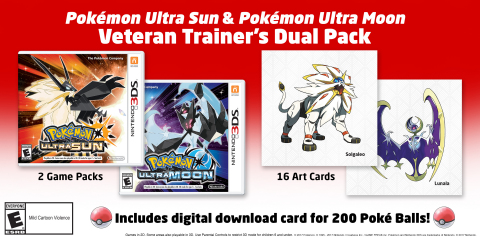This dual pack, which will be available at select retailers, includes both the Pokémon Ultra Sun and Pokémon Ultra Moon games for the Nintendo 3DS family of systems, as well as 16 art cards. Fans also will receive a digital download card for 200 Poké Balls. This special dual pack goes on sale Nov. 17 at a suggested retail price of $79.99.