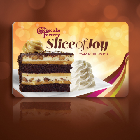 - Slice of Joy Cards and eSlice of Joy Cards may be redeemed only at The Cheesecake Factory restaurants in the United States, including Puerto Rico, from January 1, 2018 through March 31, 2018 for one complimentary slice of cheesecake or layer cake. Only one Slice of Joy Card or eSlice of Joy Card may be redeemed per guest per visit. Must be present to redeem.